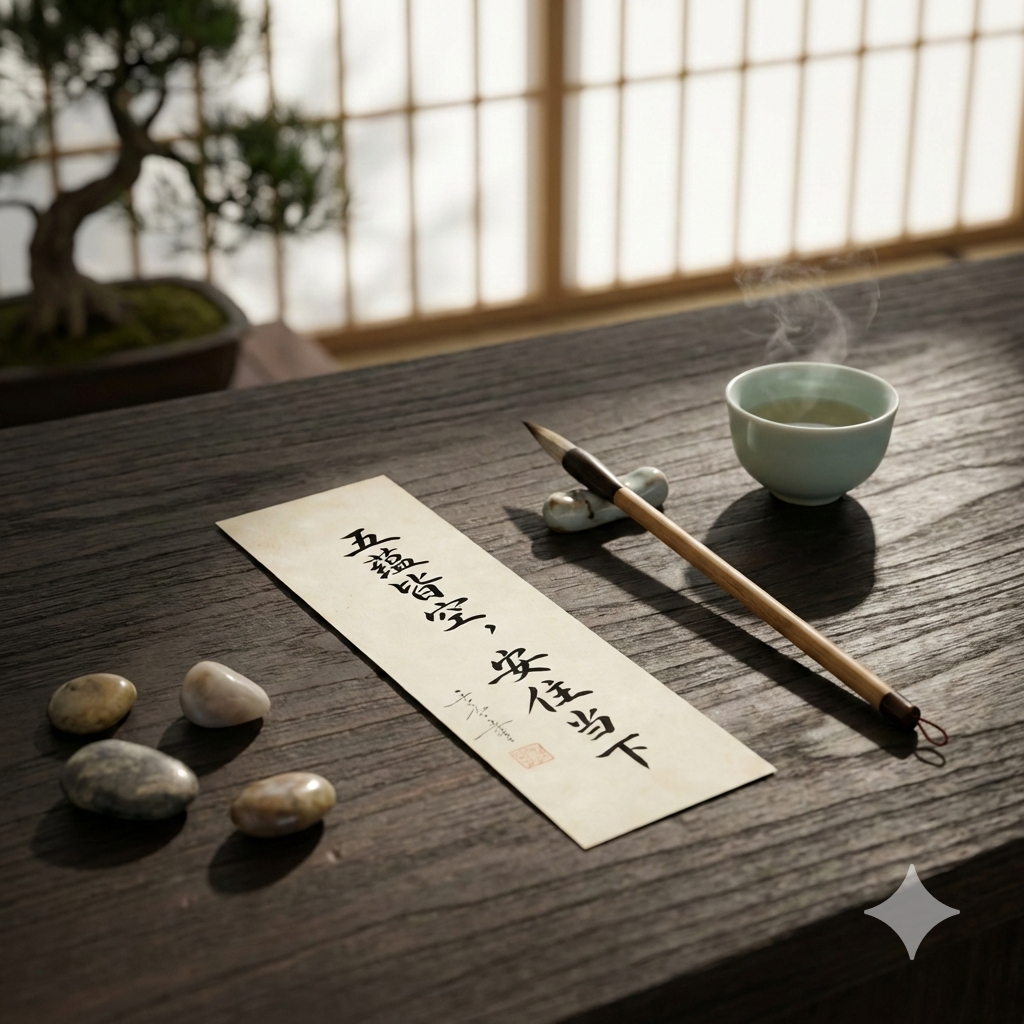Serene meditative brushwork: “Form is emptiness, abide in the present”. Tuck it in your book to stay mindful.
